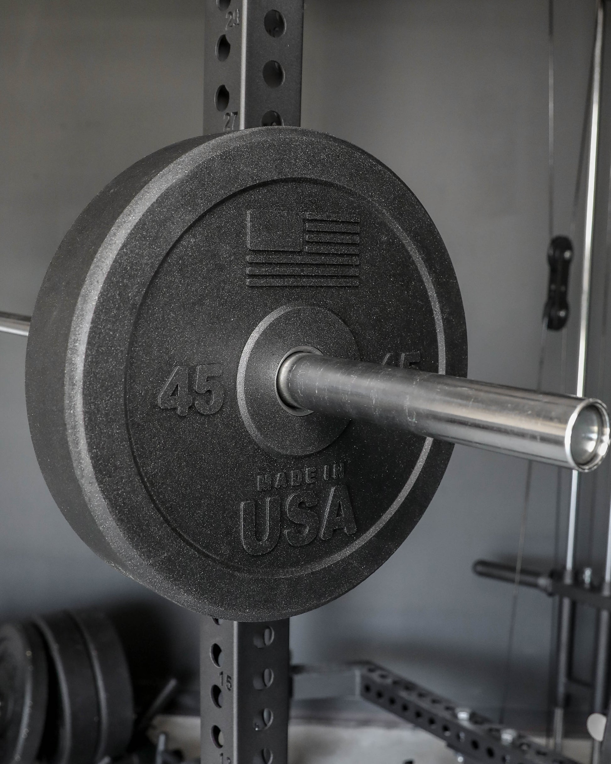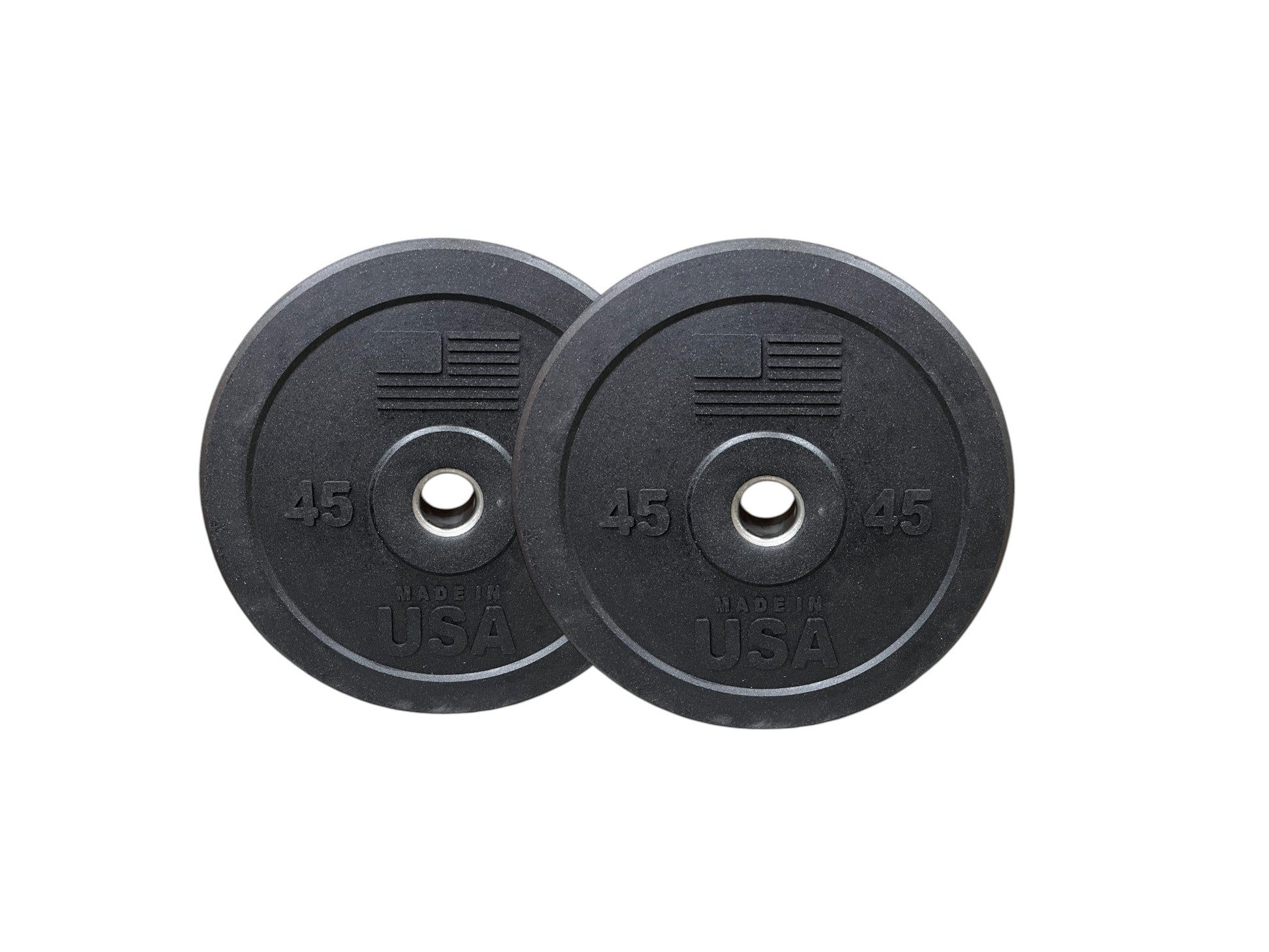 High-quality, durable and affordable weight lifting bumper plates that are manufactured in the USA. Each plate is composed of recycled crumb rubber and a top-quality urethane binder, creating a bumper plate that is durable and perfect for prolonged indoor and outdoor use. The bumper plates feature a matte black finish with recessed stainless steel inserts, creating durable, long-lasting equipment perfect for commercial and home-gyms alike.